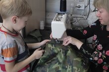 Юный волонтëр Шевелев Серафим ученик 1 класса Б. Фроловской ООШ в неделю добра помогает маме, которая работает руководителем "Гуманитарного склада" в пошиве тактических носилок для военнослужащих в зону СВО. 05.11.2022