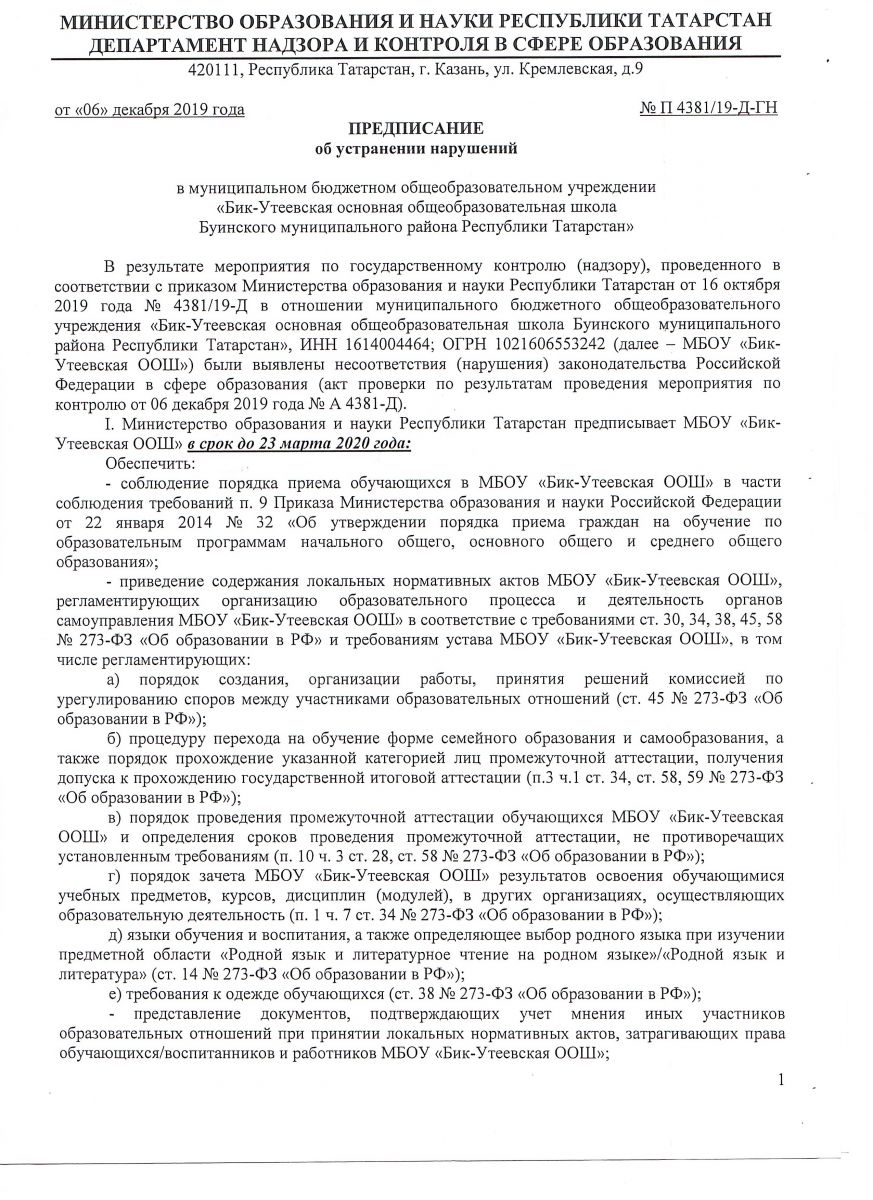Предписание об устранении нарушений № П 4381/19-Д-ГН от 06.12. 2019: