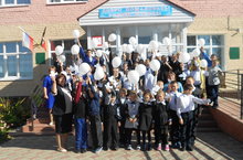 Акция "Голубь мира" . Запустили в небо прикрепленных к воздушным шарам бумажных голубей. Вся школа участвовала.