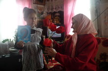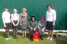 Вручение ветеранам и труженикам тыла подарков и поздравительных открыток с 71-ой годовщиной Великой Победы в Отечественной войне учащимися школы,главой сельского поселения и ЗДУР школы .
