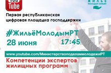 Республики Татарстан в рамках мероприятий Всероссийского Дня молодежи, в целях повышения эффективности информирования молодежи о действующих в Татарстане программах и мерах государственной поддержки молодых семей, молодых специалистов в улучшении жилищных условий 28 июня 2021 года в 17.45 проводится второй прямой эфир #ЖильёМолодымРТ.