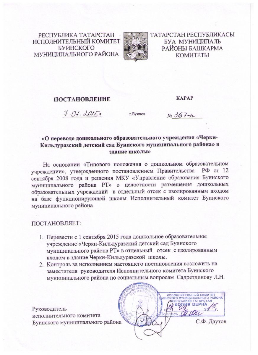 Постановление о переводе дошкольного образовательного учреждения "черки-Кильдуразский детский сад" в здание школы