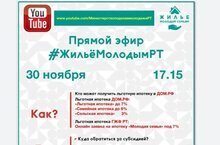 Во исполнение поручения Премьер-министра Республики Татарстан А.В.Песошина от 18.09.2021 №55023-АП, в целях повышения эффективности информирования молодых специалистов о действующих в Республике Татарстан мерах государственной поддержки молодежи в улучшении жилищных условий Министерством 30 ноября 2021 года проводится прямой эфир #ЖильёМолодымРТ. В программе прямого эфира (на площадках zoom, YouTube) в доступной и подробной форме будут представлены жилищные проекты АО «ДОМ.РФ» («Льготная ипотека» до 7% на новостройки, «Семейная ипотека» до 6% на покупку и рефинансирование, «Сельская ипотека» по ставке до 3%), а также перспективы реализации цифровизации и упрощения процедуры постановки на учет для улучшения жилищных условий для молодых семей на льготных условиях ипотеки ГЖФ Республики Татарстан.