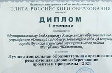 Подведены итоги Национальной премии в области образования «Элита Российского образования-2021», по результатам которого опыт работы МБДОУ «Аленушка» был признан лучшим. Коллектив МБДОУ «Аленушка» был удостоен Диплома 1 степени в номинации «Лучшая дошкольная образовательная организация, реализующая здровьесберегающие проекты и программы -2021» за выдающиеся достижения, высокий профессионализм и творческую инициативу