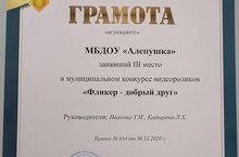 Поздравляем воспитателей Иванову Т.Н.и Кадырову Л. Х. занявших 3 место в муниципальном конкурсе видеороликов "Фликер-добрый друг" и желаем дальнейших творческих успехов.