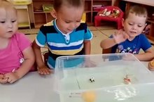 В младшей группе сегодня провели опыт с водой. Узнали о том, что тяжелые предметы тонут, а легкие плавают, остаются на поверхности воды.