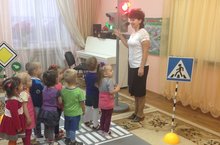 19 ноября 2015 года в средней группе прошло развлечение "В гостях у Светофорыча". К детям пришел в гости кот - учитель светофорных наук. Вместе они закрепили значение сигналов светофора, закрепили правила поведения в общественном транспорте, закрепили знание геометрических фигур". Светофор Светофорович сыграл с детьми в игру "Светофор".