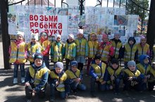 Цель акции: привлечение внимания к безопасному передвижению детей по пешеходным переходам. Старшие дошкольники вместе со своими воспитателями раздавали родителям и прохожим памятки на тему "Безопасность на дороге". С помощью трафарета юные помощники инспекторов нанесли на асфальт надпись "ВОЗЬМИ РЕБЁНКА ЗА РУКУ". Закончилась акция всеобщим флешмобом. -