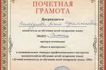Воспитатель по обучению детей татарскому языку Ахмадуллова А.М. приняла участие в муниципальном конкурсе профессионального мастерства воспитателей по обучению детей татарскому языку , который проходил 29 ноября в МБДОУ "АБВГДейка".Айгуль Мухаммятовна была награждена почетной грамотой в номинации "Опыт и мастерство.