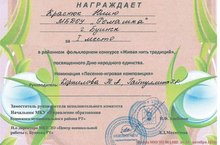 2 ноября музыкальный руководитель Корнилова Т.А. и воспитанница подготовительной группы Красюк Юля приняли участие в районном фольклерном конкурсе ко дню народного единства в номинации "Песенно-игровая композиция" и заняла 1 место.