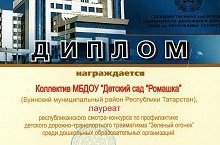 8 апреля 2016 г. коллектив МБДОУ "Ромашка" награжден дипломом лауреата республиканского смотра-конкурса по профилактике детского дорожно-транспортного травматизма "Зеленый огонек" среди дошкольных образовательных организаций и сертификатом на получение фотоаппарата Canon PowerShot SX410.