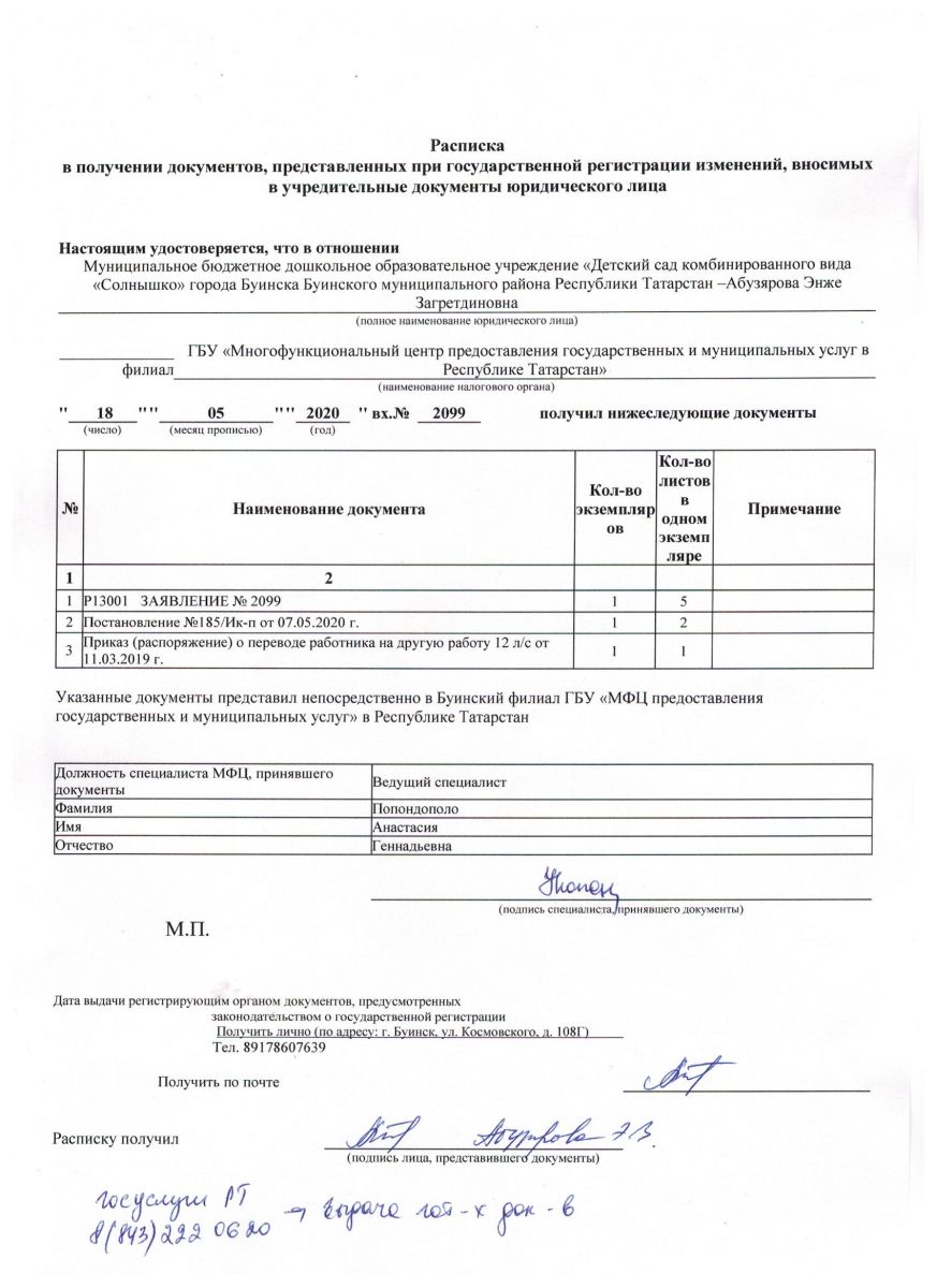 Лист изменений №2 в Устав МБДОУ "Солнышко"