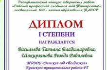На конкурс поступило 298 работ из 28 районов Республики Татарстан. Активное участие в данном конкурсе приняли и наши воспитатели разновозрастной младшей группы Васильева Т. В. и Шакирзянова Р. Р. Они удостоились Диплома I степени. -