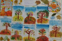 Цель: учить рисовать деревья с помощью отпечатка листьев; небо, опавшую листву – оттиском скомканной бумаги. Развивать чувство композиции, цвета.