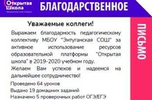 МБОУ «СОШ с.Энтуганы» БМР РТ получила благодарность за активное использование платформы “Открытая школа” .