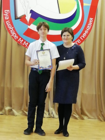 В актовом зале гимназии чествовали победителей школьного этапа Международного конкурса чтецов ”Джалиловские чтения - 2021”. 15 учащихся были награждены грамотами. Они стали лучшими в номинациях “М. Джалиль на татарском”, “М. Джалиль на русском”, “Джалиловцы на языках мира”, “Юные джалиловцы”, “Фронтовики-писатели на татарском”.