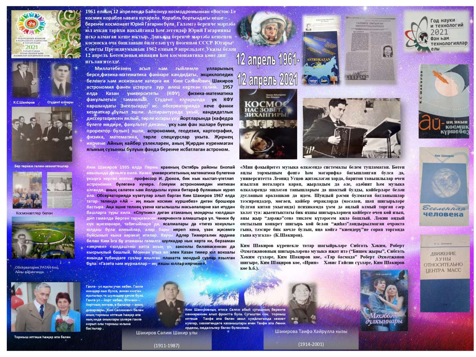 12 апреля на базе МБОУ «Гимназия имени М.М.Вахитова» состоялось районное мероприятие, посвященное 60-летию первого полета человека в космос. Мероприятие началось с открытия выставки, где на фоне звездного неба расположились макеты космических кораблей, самолетов и искусственного спутника Земли. Отдельная экспозиция посвящалась нашему земляку из отряда первых космонавтов Марсу Рафикову. Заведующий отделом Буинского краеведческого музея Альберт Гарипов рассказал о работе музея по сохранению памяти известного земляка. Большая часть мероприятия отводилась презентации жизни и деятельности астрофизика, кандидата физико-математических наук К.С.Шакирова. Учителям физики К.С.Шакиров знаком по статьям, которые публикуются в журнале “Магариф”. Он изучил вопрос о влиянии внутренней структуры Луны на ее движение. Он обработал 89 меридианных наблюдений кратера Местинг А, выполненных в Гринвиче, и наряду с параметрами ФЛЛ получил пространственные координаты кратера Местинга А относительно центра фигуры Луны. Шакиров впервые в мире доказал, что центр масс Луны расположен на 3,3 км ближе к Земле относительно центра ее фигуры. Его работы освещены в книгах: «Обратная сторона Луны», «Ай – иң якын күршебез», «Вселенная человека». К юбилею полета Ю.А.Гагарина в космос в соавторстве с Х.Гайнутдиновым им выпущена книга «Космос нас зовёт, Зихангиры» (2011г). Книга издана при поддержке Президента Республики Татарстан Р.Н.Минниханова.