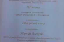 Поздравляем ученика 6 класса Юркина Алексея с III местом в республиканском конкурсе сочинений в рамках Парламентского урока "Парламент, общество и я" среди учащихся 5-6 классов в номинации "Мой родной язык".