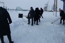 Коллектив учителей и тех. персонала очистили от снега территорию школы после снегопада.
