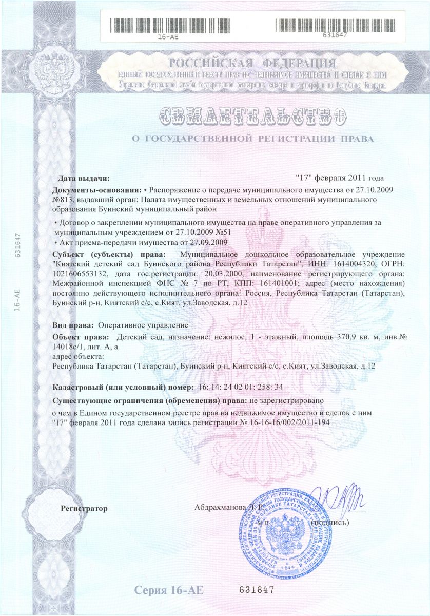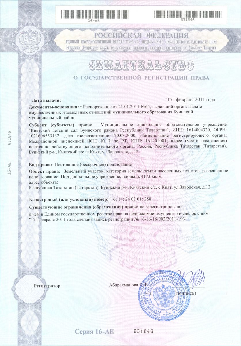 Cвидетельство о регистрации земельного участка под здание ДОУ