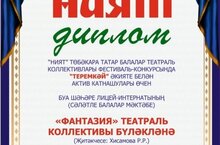 "Ният" төбәкара татар балалар театраль коллективлары фестиваль-конкурсында "Теремкәй" әкияте белән актив катнашулары өчен Буа шәһәре лицей-интернатның "Фантазия" театраль коллективы диплом белэн бүләкләнә. Киләчәктә дә уңышлар телибез. Җитәкчесе: Хисамова Р.Р.