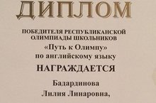 11 нче сыйныф укучысы Бадардинова Л., Инглиз теле буенча «Олимпка юл» республика олимпиадасы җиңүчесе (укытучысы Измайлова Г. Ш.), Афәрин, Лилия!!!