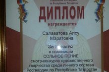 Салаватову А.,ученицу 2 класса,занявшую 2 место в номинации "Сольное пение" смотр-конкурса художественного творчества среди личного состава Росгвардии Республики Татарстан