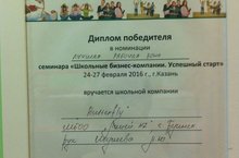 Школьную БИЗНЕС-КОМПАНИЮ в составе учащихся 10 класса(Самигуллиной А., Шакуровой И., Сафиуллина Б., Закирзянова К.),завоевавшую диплом победителя в номинации"Лучшая рабочая зона"(рук.Мулеева А.Ю.)