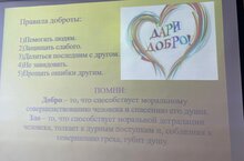 При проведении классных часов была изучена литература по проблеме, продуманы вопросы для учащихся, подобраны наглядные пособия. Учащиеся разучивали стихи, песни, подготовили сценки. Дети внимательно слушали рассказы своих классных руководителей и сами рассказывали стихи о доброте и человечности людей. Учащиеся вспоминали свои добрые дела к родителям, бабушкам, дедушкам, учителям. Еще много теплых слов прозвучало во время классных часов. Дети с удовольствием участвовали в обсуждении темы, связанной с добротой, заботой, участием, милосердием. Судя по всему, после этих классных часов учащимся захотелось проявить участие и доброту не только к близким, но и к совершенно незнакомым людям, нуждающимся в помощи.