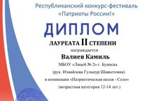Поздравляем Валиева Камиля, ученика 8 класса , лауреата ll степени республиканского конкурса-фестиваля «Патриоты России» номинация «Патриотическая песня-Соло»( рук. Измайлова Г.Ш.) Молодец, Камиль!!!