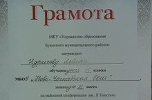 Поздравляем ученицу 11 класса Идрисову Л., занявшую 3 место на районной конференции им. Л.Толстого в номинации " Книги-юбиляры".
