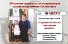 17 февраля на базе СОШ №1 состоялся муниципальный этап XV научно-практической конференции школьников имени Л.Н.Толстого. Ученица 5 класса Ахмадуллина Чулпан (рук. учитель русского языка и литературы Ахмадуллина Г.Р.) заняла 3 место. 27.02.2017