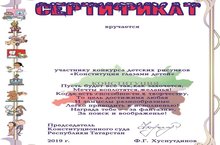 Ученик 1 класа Величко Ильвар награждён Сертификатом участника Республиканского конкурса рисунков «Конституция глазами детей» за подписью председателя Конституционного суда Республики Татарстан Ф.Г. Хуснутдинова. Поздравляем! (Руководитель: Гизатуллина Г.Р.) 25.06.2019