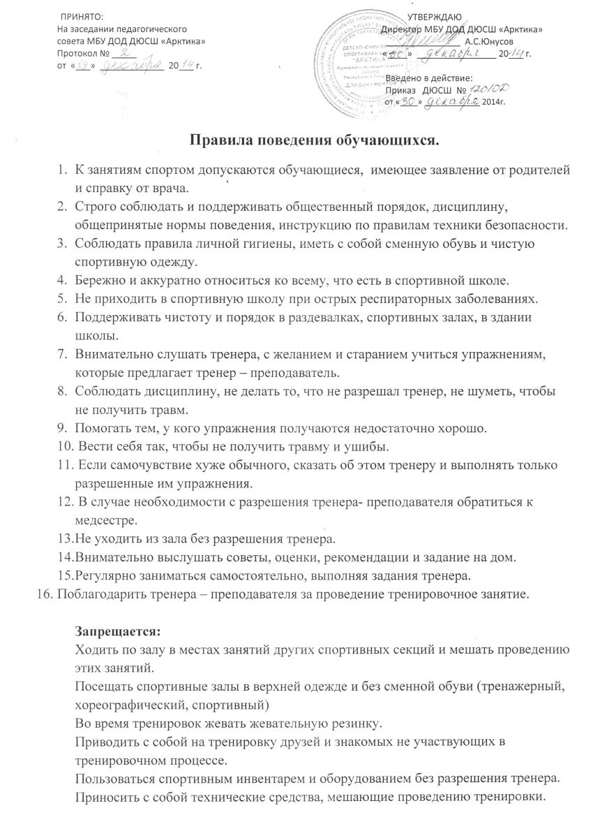 Правила поведения обучающихся МБУ СШ "Арктика"
