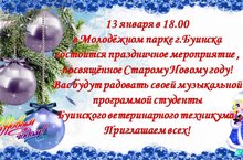 13 января в Молодёжном парке г.Буинска студенты Буинского ветеринарного техникума совместно с Центром культурного развития провели праздничное мероприятие,посвящённое Старому Новому году!Праздничная программа сопровождалась музыкальными номерами,играми,конкурсами. Дети радостно встретили героев праздника-Деда Мороза,Снегурочку и Бабу Ягу.Все желающие могли угоститься горячим чаем и вкусными блинами.