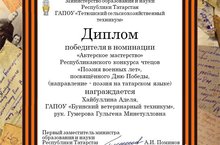 В преддверии праздника - Дня Победы в ГАПОУ «Тетюшский сельскохозяйственный техникум» прошел Республиканский конкурс чтецов «Поэзия военных лет» посвящённый Дню Победы. Из нашего техникума участвовала Хайбуллина Аделя, студентка 2 курса отделения «Экономика, бух.учет», была награждена дипломом победителя в номинации «Актерское мастерство". Желаем Адиле дальнейших успехов!