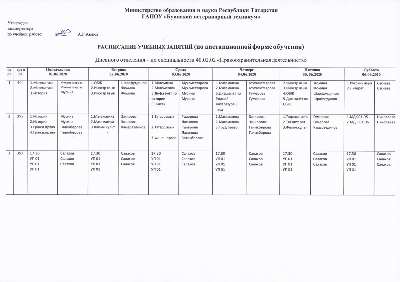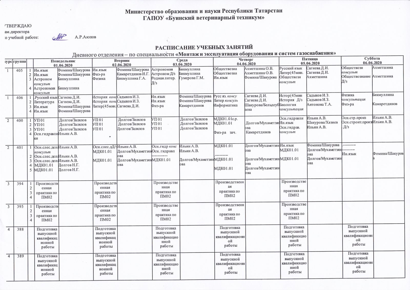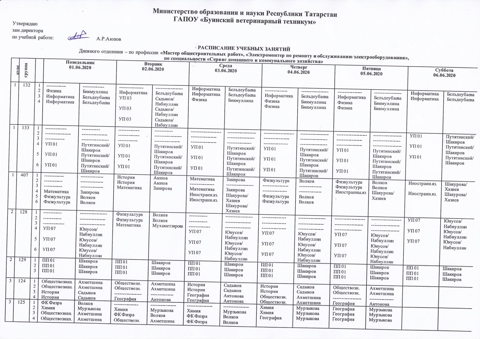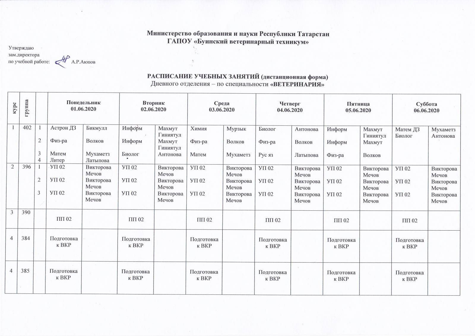 расписание занятий отделения "Ветеринария" с 01.06.2020 по 06.06.2020