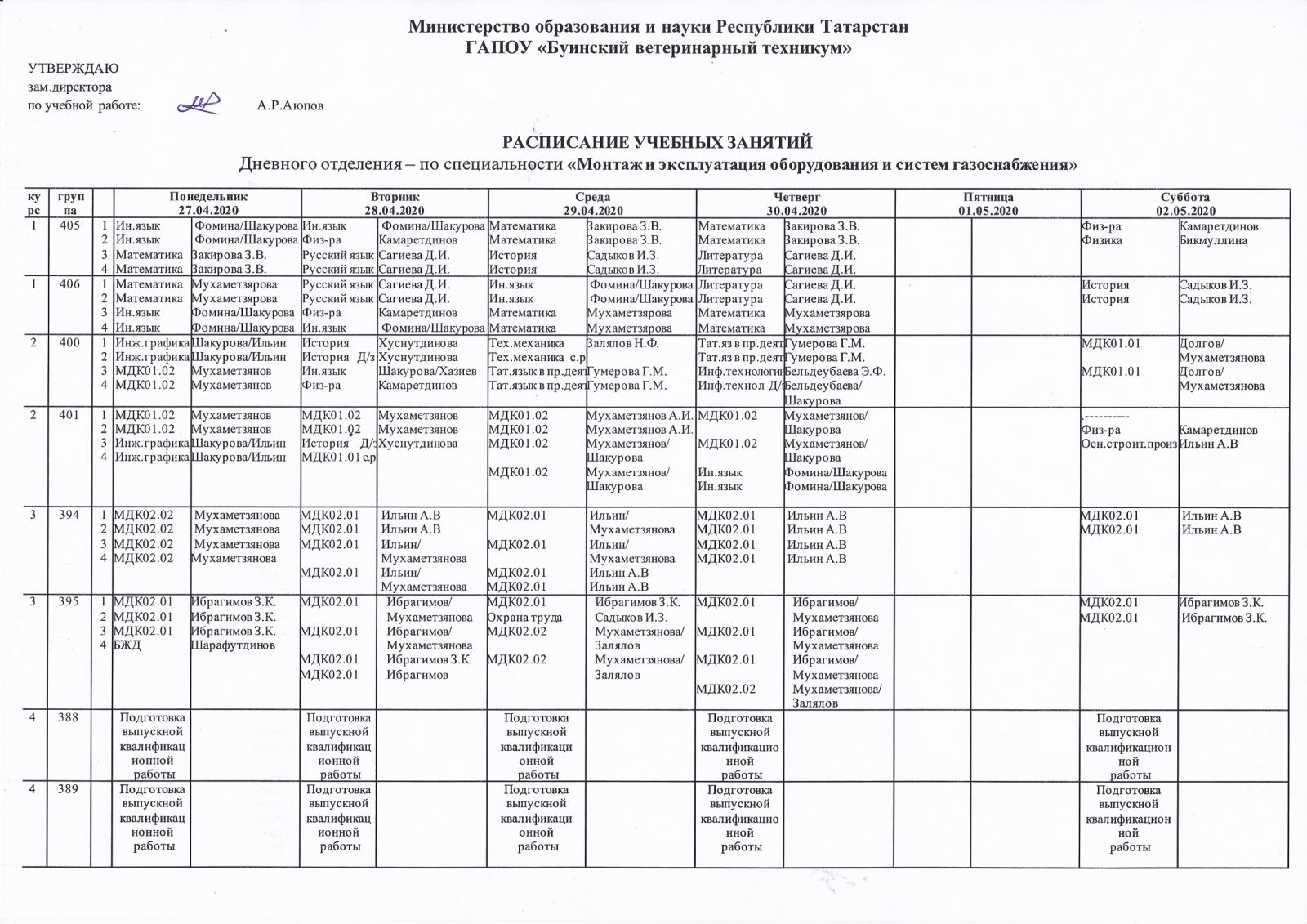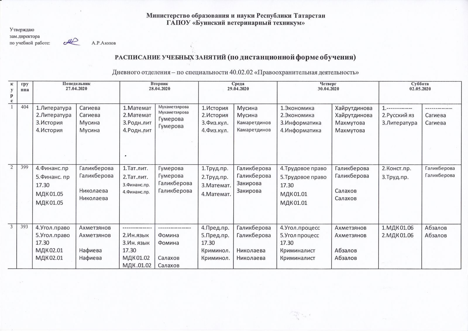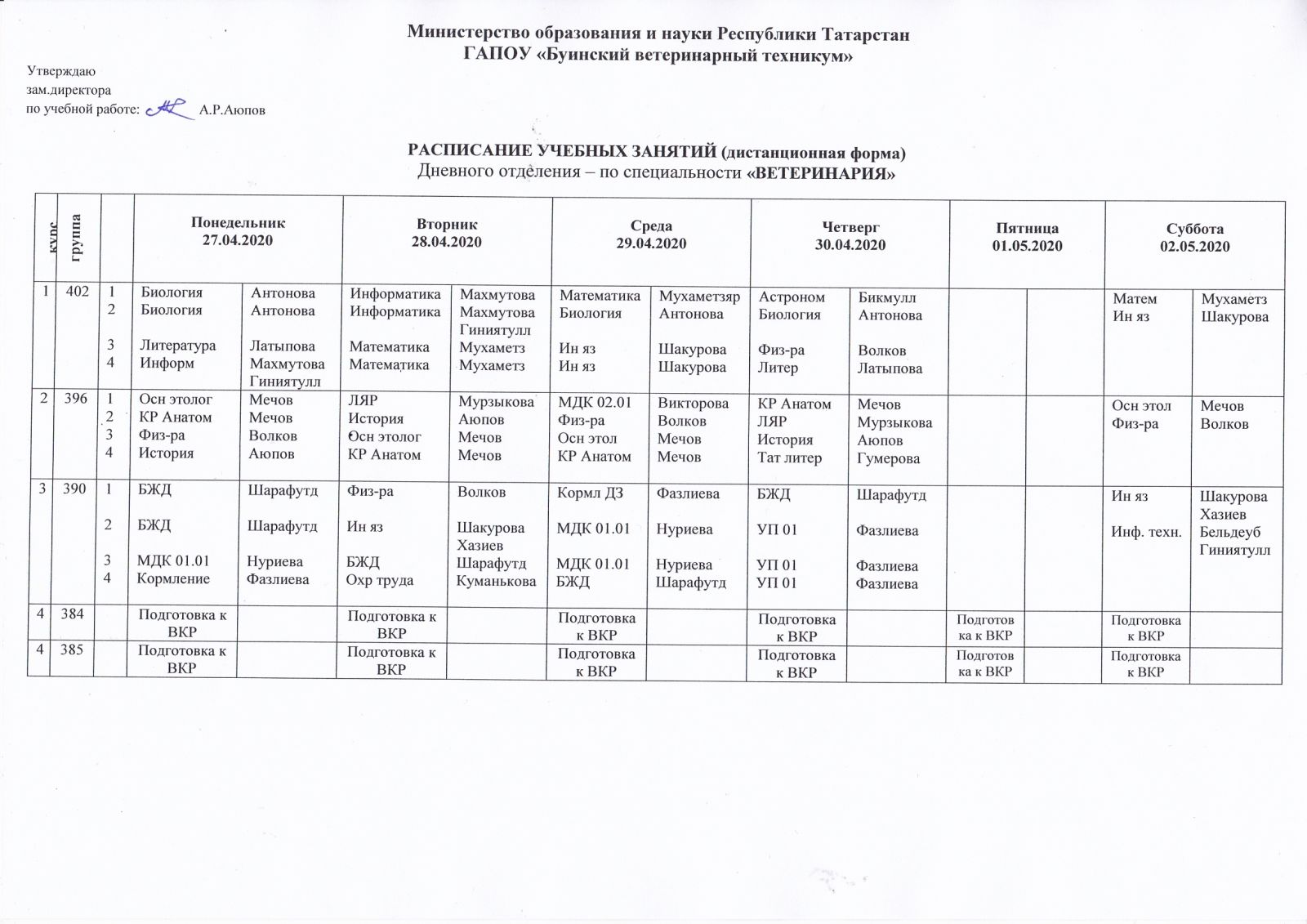 расписание занятий отделения "Ветеринария" с 27.04.2020 по 02.05.2020