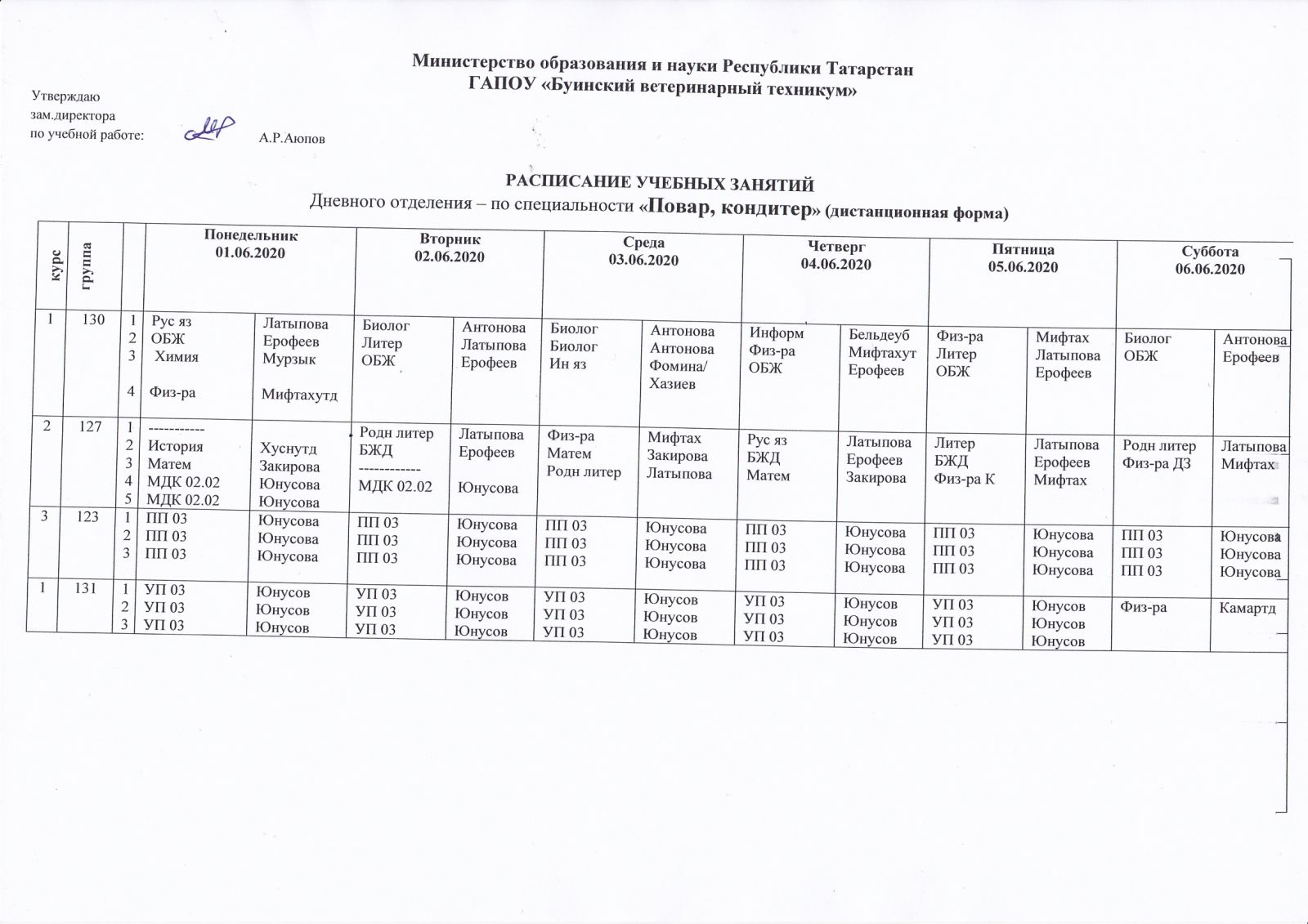 расписание занятий отделения "Повар, кондитер" с 01.06.2020 по 06.06.2020