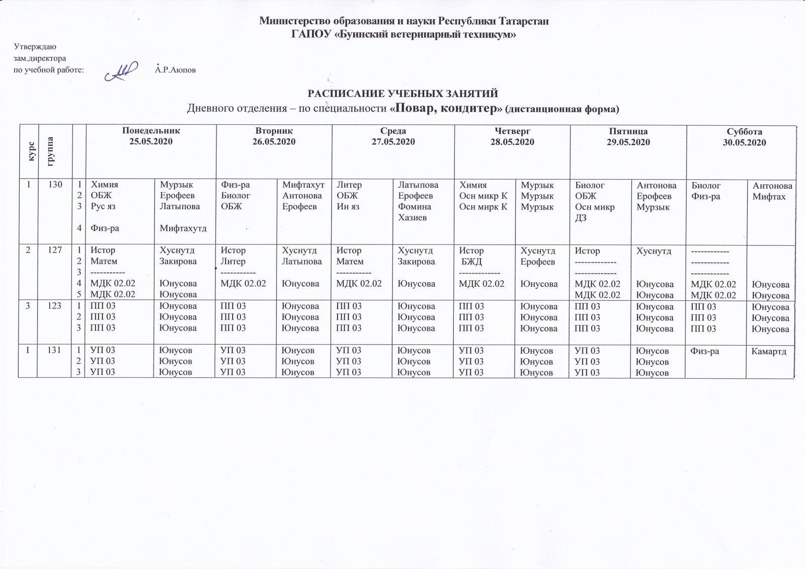 расписание занятий отделения "Повар, кондитер" с 25.05.2020 по 30.05.2020