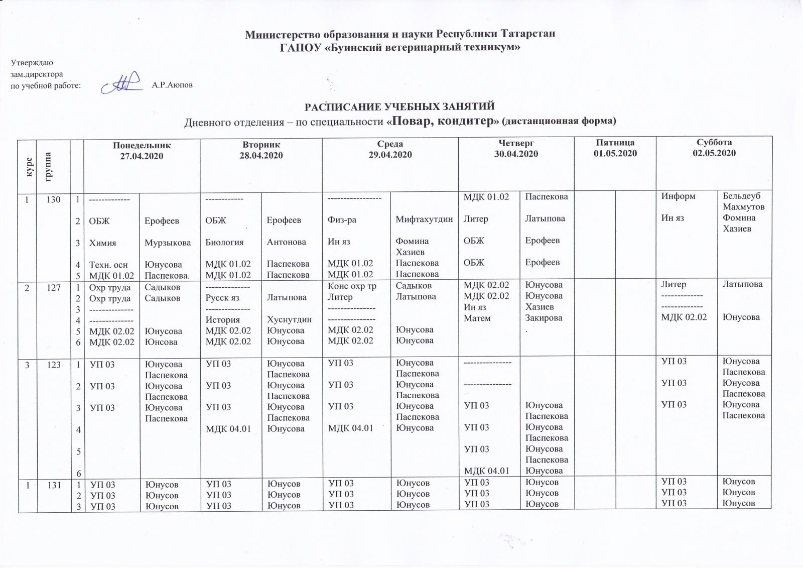 расписание занятий отделения "Повар, кондитер" с 27.04.2020 по 02.05.2020