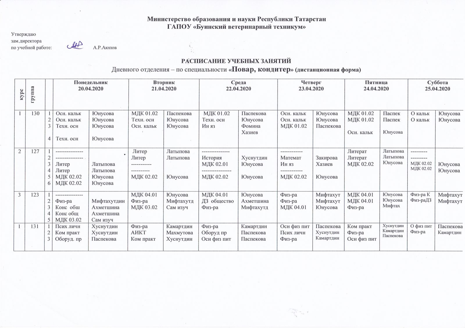 расписание занятий отделения "Повар, кондитер" с 20.04.2020 по 25.04.2020