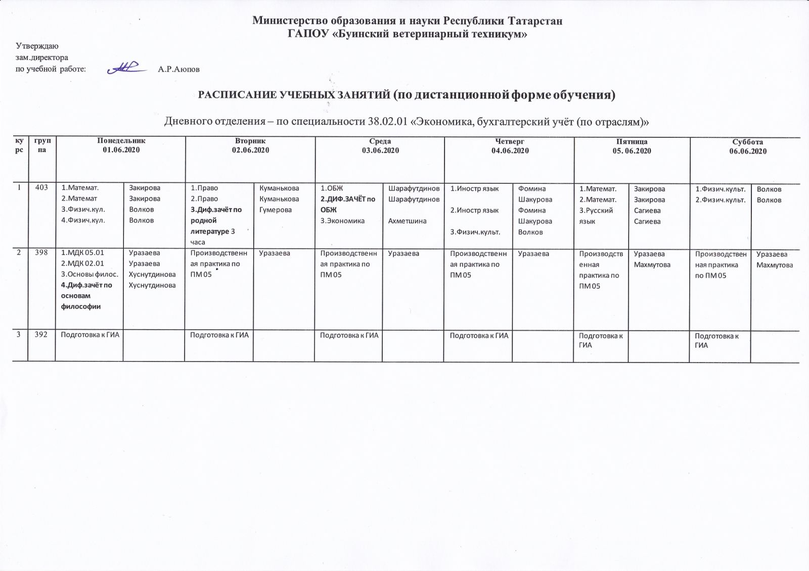 расписание занятий отделения "Экономика и бухгалтерский учет" с 01.06.2020 по 06.06.2020