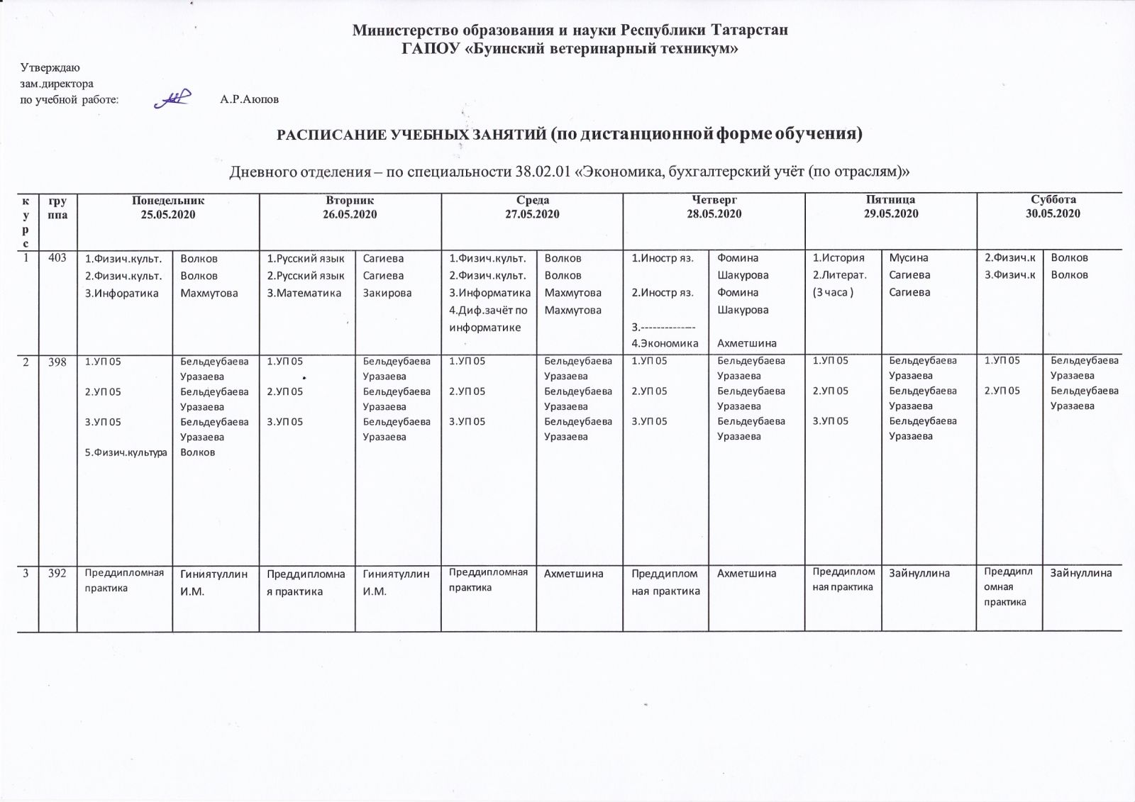 расписание занятий отделения "Экономика и бухгалтерский учет" с 25.05.2020 по 30.05.2020