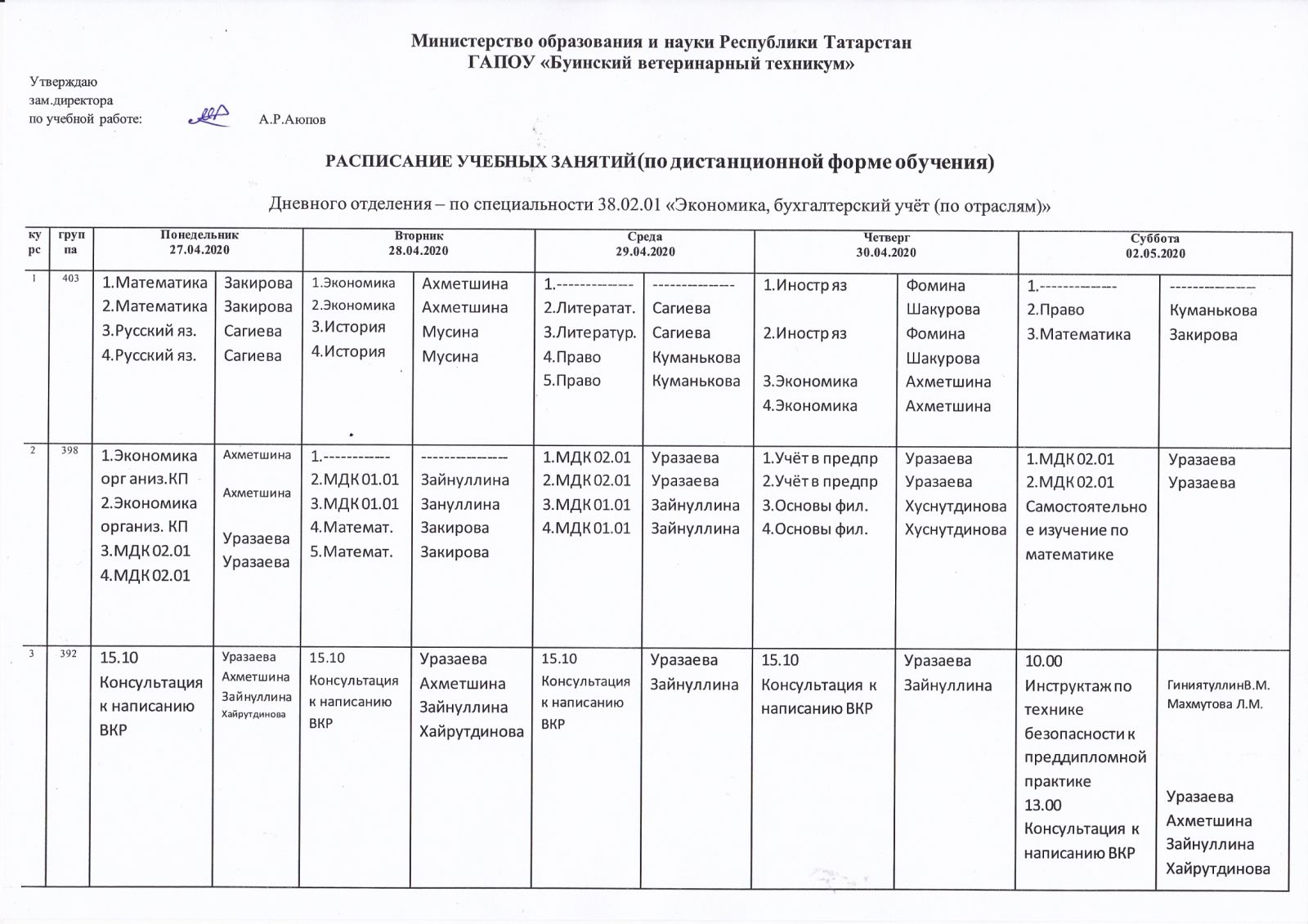 расписание занятий отделения "Экономика и бухгалтерский учет" с 27.04.2020 по 02.05.2020