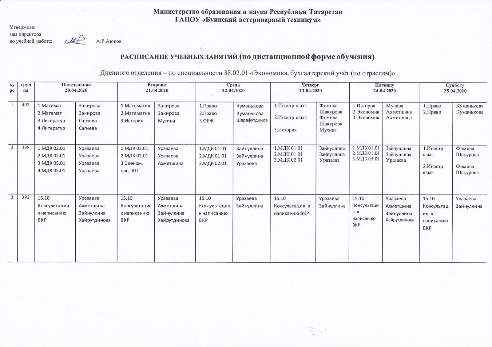 расписание занятий отделения "Экономика и бухгалтерский учет" с 20.04.2020 по 25.04.2020
