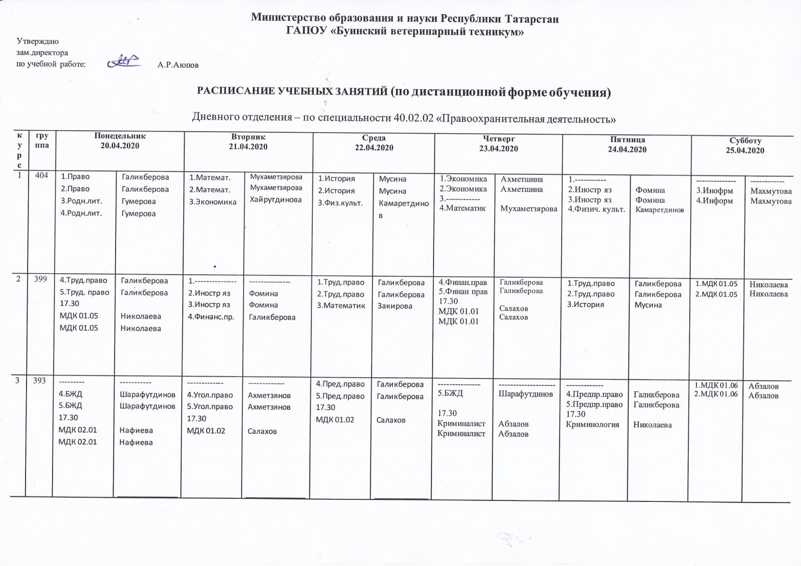 расписание занятий отделения "Правоохранительная деятельность" с 20.04.2020 по 25.04.2020