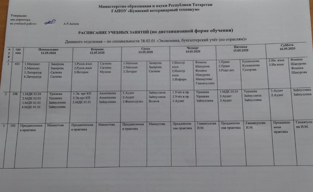 расписание занятий отделения "Экономика и бухгалтерский учет" с 11.05.2020 по 16.05.2020