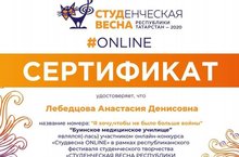 Студентка 102 группы Буинского медицинского училища Лебедцова Анастасия награждена Сертификатом за участие в онлайн-конкурсе "Студвесна ONLINE" в рамках республиканского фестиваля студенческого творчества "Студенческая весна Республики Татарстан - весна Победы в 2020 году.