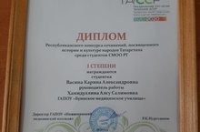 Студентка ГАПОУ "Буинское медицинское училище" Васина Карина заняла 1 место в Республиканском конкурсе сичинений, посвященных истории и культуре народов Татарстана среди студентов средних медицинских образовательных ооганизаций Республики Татарстан (преподаватель Хамидуллина А.С.).